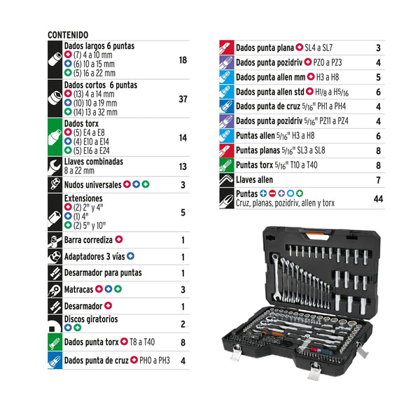 37 Dados cortos 6 puntas: (13) 4 a 14 mm, (10) 10 a 19 mm, (14) 13 a 32 mm