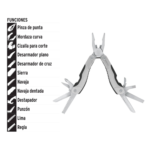 Funciones: Pinza de punta, Mordaza curva, cizalla para corte, desarmador plano, desarmador de cruz, sierra, navaja, navaja dentada, destapador, punzón, lima y regla