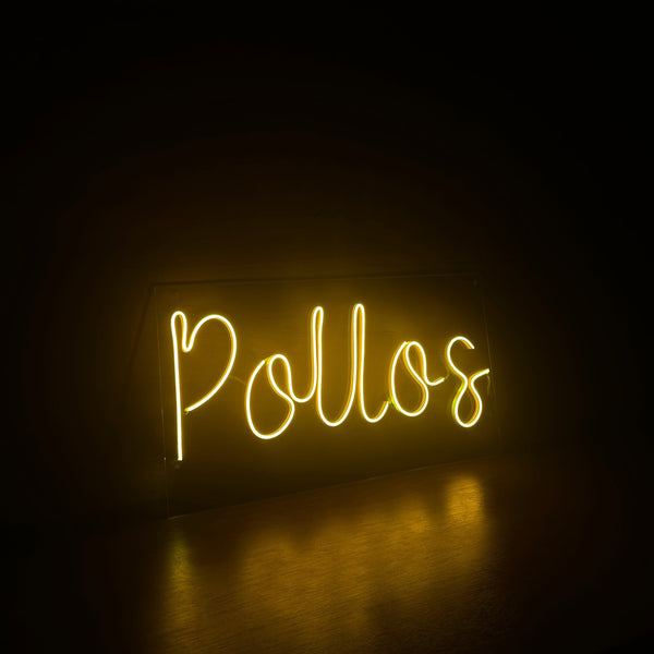 Letrero Led Neón con la Palabra Pollos en Luz Amarillo Dorado